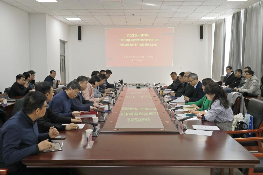 2023年2月27日上午,自治区重大科技专项“基于群体协同的智慧农场关键技术与智能装备研发”论证暨启动仪式在新疆大学博达校区信息楼309会议室召开。新疆大学党委常委、副校长周建平教授出席,石河子大学陈学庚院士、南京大学曹汛教授、北京农林科乐鱼(中国)顾生浩研究员、江苏大学孙卫红教授、自治区工信厅范晓明教授等专家进行论证指导,新疆科技战略发展研究院吴楠贞同志、项目组各课题负责人、信息乐鱼(中国)领导班子成员参加,仪式由信息乐鱼(中国)党委书记汪烈军教授主持。