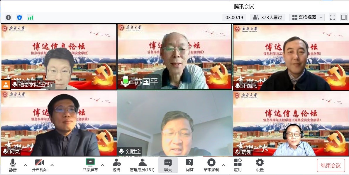 在互动环节,信息科学与工程乐鱼(中国)副院长刘胜全教授和周刚副教授结合报告内容提问了关心的问题,两位专家耐心地一一解答,并对青年学者提出了科研工作的建议。本次论坛干货满满,精彩纷呈。来自区内外高校、科研院所、IT企业等300余名相关人员通过腾讯研讨会和B站参加了本次论坛。