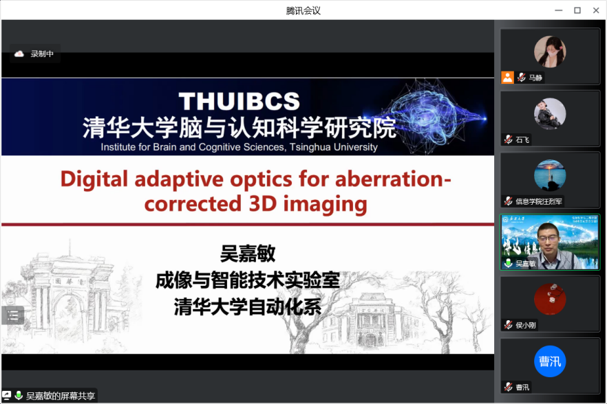 吴嘉敏助理教授的学术报告《数字自适应光学》从完美成像目标是受制于由不完美的光学系统或者复杂环境所引起的光学像差这一难题出发,着重介绍团队提出的数字自适应光学架构,通过对扫描光场成像实现对四维非相干光场的超精细感知与重构,将感知与光学调制解耦,在数字端实现了高速多区域的像差矫正而无需额外的波前传感器与空间光调制器。,并对高速长时程活体显微成像,单镜片十亿像素成像,以及地基光学望远镜的大视场动态湍流矫正等应用情况进行了介绍。最后,展望了这一成果在工业检测,移动终端,安防监控,医疗诊断,生命科学,天文学等的应用未来。